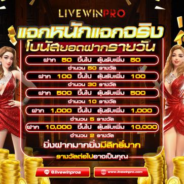 จุดเด่นของโปรโมชั่นจาก LiveWinPro คือความหลากหลายและความสม่ำเสมอ สมาชิกสามารถติดตามกิจกรรมหรือแคมเปญประจำวัน เพื่อรับโบนัสเพิ่มเติมตามเงื่อนไขที่กำหนด ไม่ว่าจะเป็นโบนัสฝากเงิน โบนัสคืนยอดเสีย หรือกิจกรรมพิเศษในช่วงเทศกาล สิทธิประโยชน์เหล่านี้ช่วยเพิ่มโอกาสทำกำไรและสร้างประสบการณ์การเล่นที่สนุกยิ่งขึ้น